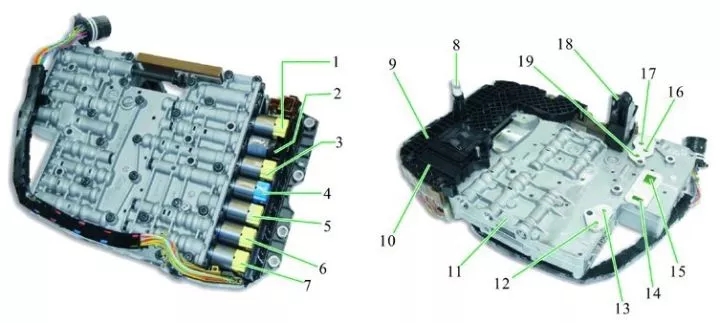 1—壓力調(diào)節(jié)閥6;2—電磁閥1;3—壓力調(diào)節(jié)閥4;4—壓力調(diào)節(jié)閥5;5—壓力調(diào)節(jié)閥3;6—壓力調(diào)節(jié)閥2;7—壓力調(diào)節(jié)閥1;8—變速器輸出軸轉(zhuǎn)速傳感器;9—自動變速器控制單元;10—電子模塊;11—液壓模塊;12—離合器A;13—離合器E;14—吸油管道(從系統(tǒng)壓力閥到ATF泵);15—來自ATF泵的壓力管道(系統(tǒng)壓力);16—液力耦合器關(guān);17—去往ATF冷卻器;18—變速器輸入軸轉(zhuǎn)速傳感器;19—液力耦合器開
