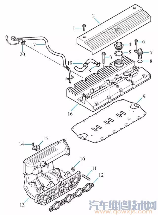 發(fā)動機凸輪軸(氣門室)罩蓋、火花塞蓋和進氣歧管及相關(guān)拆解零部件位置和名稱圖解