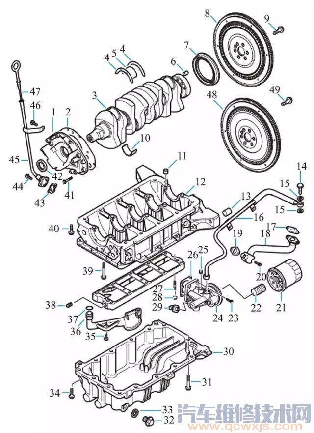 2.發(fā)動機曲軸、油底殼和油泵拆解零部件名稱圖解