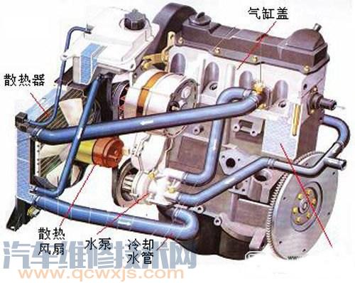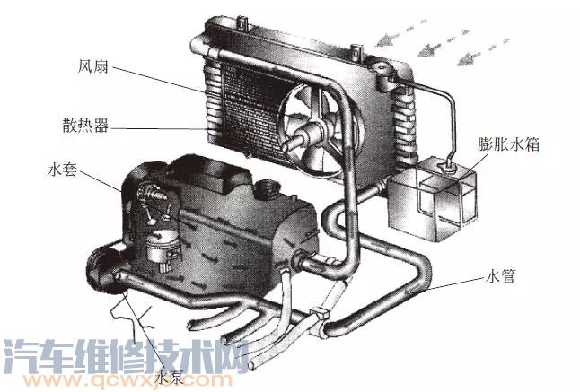 水冷卻系統(tǒng)一般是由膨脹水箱、散熱器、水泵、風扇、水套和溫度調(diào)節(jié)裝置等組成。