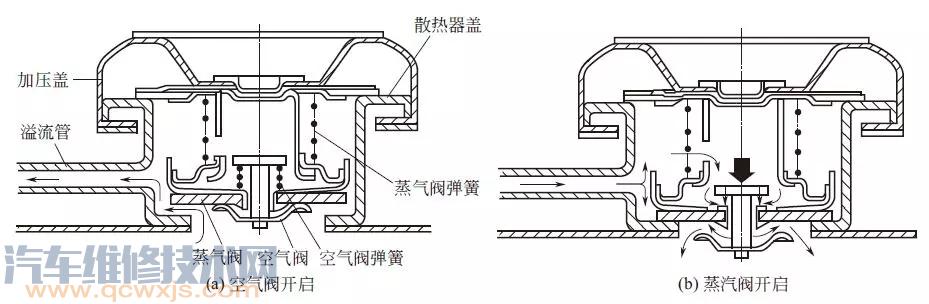 當冷卻系統(tǒng)內(nèi)蒸氣壓力低于大氣壓力0.01~0.012MPa時,空氣閥便開啟,如圖中(a)所示??諝鈴恼魵馀懦龉苓M入散熱器,以防止散熱器被大氣壓癟。