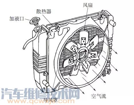 風扇通常安裝在散熱器后面,并與水泵同軸,與水泵一起轉(zhuǎn)動。其功用是提高通過散熱器芯的空氣流速,增強散熱效果,加速冷卻液的冷卻。