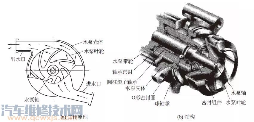 水泵用螺栓固定在發(fā)動機前端面上,通過傳動帶與曲軸帶輪相連。其功用是對冷卻液加壓,使冷卻液循環(huán)流動。車用發(fā)動機多采用離心式水泵。