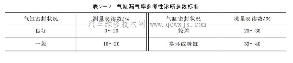 這樣,氣缸漏氣率的檢測,可通過搖轉曲軸從壓縮行程一開始就進行,一直進行到壓縮行程終了上止點位置。氣缸漏氣率的診斷參數標準可參考國外經驗,見表2-7。