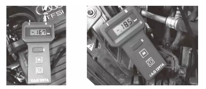 (3)發(fā)動機異響。需進一步排查:打開機油加注口異響消除。檢查曲軸箱負壓在-190~-160mbar之間,如下圖所示,曲軸箱負壓不正常(正常值應為-50~-20mbar),由此可以判斷出曲軸箱通風系統(tǒng)堵塞。