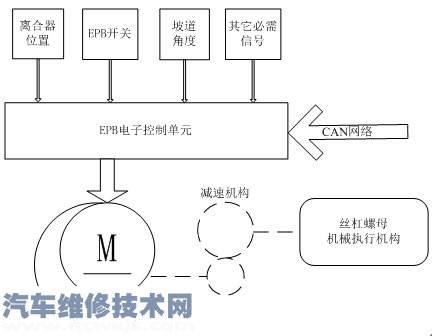 汽車各控制系統按大類分為:舒適系統、安全系統和動力系統車身控制單元(BCM)適合應用于12V和24V兩種電壓工作環境,可用于轎車、大客車和商用車的車身控制。輸入模塊通過采集電路采集各路開關量和模擬量信息輸入,LIN接收模塊接收控制手柄單元信號(燈光、雨刮、洗滌等信號),輸出模塊采用功率驅動和繼電器驅動實現,有很好的性價比,CAN通信模塊實現與其它汽車電子模塊信息交換。主要實現車身門控制包括門鎖、各種燈光、前后洗滌、前后雨刮、電動車窗等控制。在軟件上實現了NM(CAN)網絡管理、UDS診斷、CCP標定等功能并通過DV實驗。EPS是提供輔助轉向動力的系統。駕駛員在操縱方向盤進行轉向時,轉矩傳感器檢測到轉向盤的轉向以及轉矩的大小,將電壓信號輸送到電子控制單元,電子控制單元根據轉矩傳感器檢測到的轉距電壓信號、轉動方向和車速信號等,向電動機控制器發出指令,使電動機輸出相應大小和方向的轉向助力轉矩,從而產生輔助動力。電子駐車制動系統是由電子控制方式實現停車制動的技術,它將行車過程中的臨時性制動和停車后的長時性制動功能整合在一起,控制方式從之前的機械式手剎拉桿變成了電子機械控制。EPB的結構和原理如圖所示。
