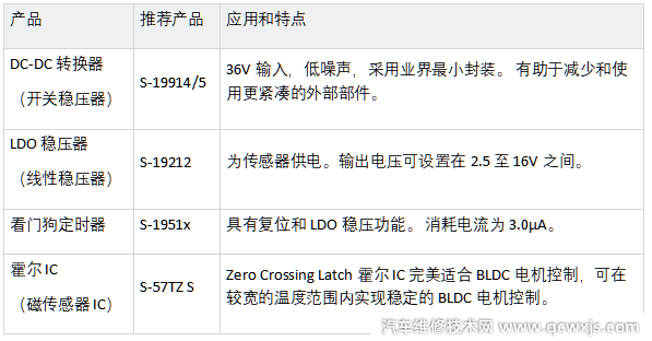 ABLIC 已經生產了許多適合 48V MHEV 輔助電機運行的高質量 IC。ABLIC 提供全面的產品系列,例如:內置看門狗定時器(用于監控 MCU)的 LDO、內置擴頻時鐘生成電路的DC-DC(低 EMI)、可以作為傳感器電源的LDO和特別適用于BLDC 電機的Zero Crossing Latch霍爾 IC。