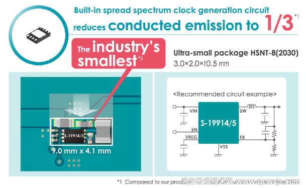 DC-DC轉換器S-19914/5系列 低噪音 超小型封裝 以業界最小的超小型封裝實現低噪音! 內置擴頻時鐘生成電路,可將傳導噪音減低至我們傳統產品的 1/3 左右。降壓型開關穩壓器(DC-DC 轉換器)具有 36V 輸入,能夠直接連接到電池,1A 輸出電流,采用業界最小封裝 HSNT-8(2030),包含外部部件在內的總安裝面積也為業界最小。 |