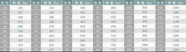 輪胎的載重指數(shù)代表了單個輪胎的額定承載重量,一般來說小型汽車配備了4個輪胎,相應的額定承載重量要乘以4。以下是載重指數(shù)實際代表的額定承載重量,單位為Kg。