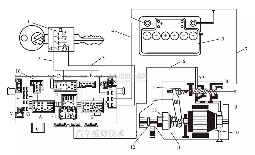 1—點火開關(guān);2—紅色線;3,6—紅/黑色線;5—蓄電池;4,7—黑色線;8—電磁開關(guān);9—定子;10—轉(zhuǎn)子;11—起動機總成;12—小齒輪;13—單向離合器;14—移位撥桿;15—回位彈簧;16—中央線路板