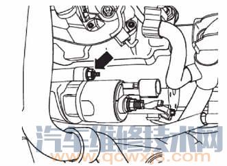 (6)將上部固定螺栓從起動機上旋出(圖2-11箭頭位置),向上從車輛中取出起動機。