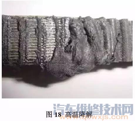 耐高溫橡膠皮帶結(jié)構(gòu)可用于這種要求高溫環(huán)境的應(yīng)用中,這些特殊的皮帶結(jié)構(gòu)提高了皮帶的使用壽命。如果要了解特殊耐高溫結(jié)構(gòu)皮帶在特殊的應(yīng)用下是否能夠提高皮帶性能,請(qǐng)與蓋茨的銷售人員聯(lián)系。蓋茨保力強(qiáng)GT2 的皮帶,帶體材料屬于熱塑性聚氨酯材料(有熔點(diǎn))。當(dāng)溫度超過85℃時(shí),帶齒可能會(huì)變軟并且變形。此外,芯線也會(huì)完全喪失對(duì)帶體的支撐能力。圖18 是暴露在高溫條件下的保力強(qiáng)GT2 的皮帶。