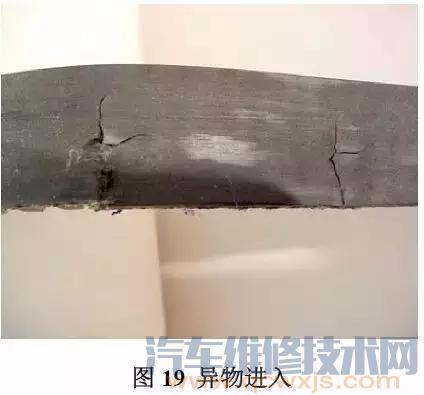 異物進(jìn)入帶輪和皮帶之間時(shí),對(duì)帶齒和芯線都會(huì)造成損壞。芯線通常在內(nèi)部斷裂(圖19 所示)或不久后由于過度彎曲而失效(圖20 所示)。
