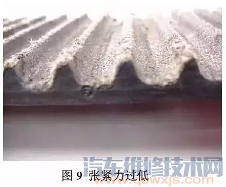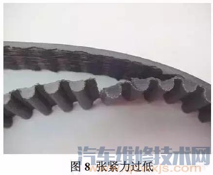 中度到高度負(fù)荷的傳動(dòng)系統(tǒng)中安裝張力過低也會(huì)導(dǎo)致皮帶過早的失效。通常張力過低導(dǎo)致的皮帶失效模式表現(xiàn)為跳齒。皮帶跳齒是指皮帶的齒爬出其對(duì)應(yīng)的輪槽,并且其根部不再承受負(fù)荷。傳動(dòng)負(fù)荷進(jìn)一步作用于皮帶側(cè)面使皮帶齒部彎曲,然后跳動(dòng)。齒部滾動(dòng)時(shí)可導(dǎo)致橡膠從齒根沿著芯線撕裂。隨著橡膠撕裂的擴(kuò)散,皮帶齒部開始以條狀脫離皮帶,如圖8 所示。由于過多跳齒導(dǎo)致的失效可能看起來好像橡膠與線繩的粘度不夠。然而,由于粘度不足所導(dǎo)致的失效,皮帶中外露芯線通常保持整潔,與滾齒失效模式不同。