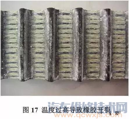 當(dāng)橡膠皮帶工作在高溫(高于85℃)較長一段時(shí)間后,橡膠成分會(huì)變硬,由于運(yùn)轉(zhuǎn)時(shí)彎曲導(dǎo)致背部開裂。這些開裂處與齒的方向平行,并且常常發(fā)生在帶齒中間。如圖17。皮帶由于齒部剪切也會(huì)導(dǎo)致拉伸性斷裂。