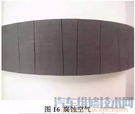皮帶運(yùn)行在腐蝕性空氣的應(yīng)用領(lǐng)域時(shí),比如翻砂攪拌機(jī),鐵礦石加工設(shè)備,磷酸鹽采礦輸送設(shè)備,帶齒側(cè)面和皮帶齒底高度會(huì)磨損,磨損區(qū)域常常光亮。圖16 為在高腐蝕性環(huán)境中的保力強(qiáng)GT2的磨損皮帶。在腐蝕空氣下帶輪通常磨損加快,所以帶輪與皮帶應(yīng)該一起更換。為了延長皮帶和帶輪的壽命,最好安裝個(gè)有潔凈空氣加壓的密封罩,防止腐蝕性的灰塵物體進(jìn)入而污染。