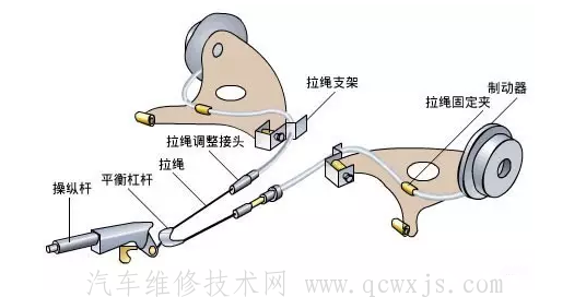 傳統手剎主要由:制動桿,拉線,制動機構以及回位彈簧組成。