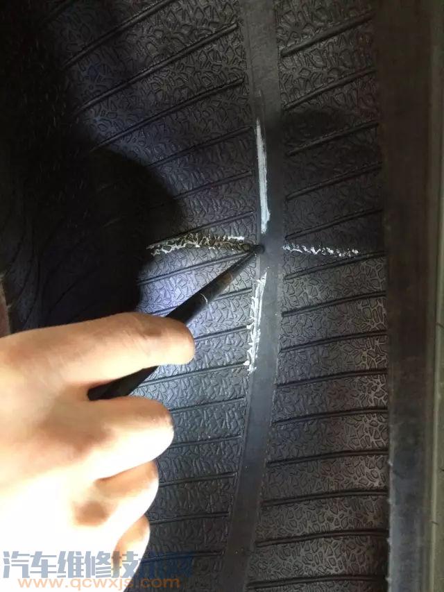 拆下被扎的輪胎,取出上面的釘子;準備好“蘑菇釘”;發現輪胎傷口,并對傷口部位進行內外標記
