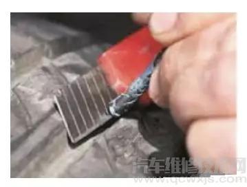 ② 處理扎孔 使用錐形銼,插入車胎被扎出的孔中,來(lái)回抽動(dòng)數(shù)下。目的是將孔的創(chuàng)面銼出毛茬,以便插入膠條后能嚴(yán)密結(jié)合。