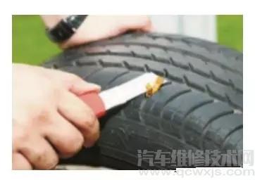 ④ 拔出工具 將錐子從車胎中拔出。拔出時(shí)動(dòng)作要很慢,以保證在拔出錐子的同時(shí),能把原先已進(jìn)入胎中的膠條再帶出兩股。