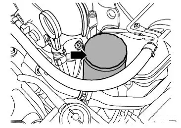 EA888發(fā)動機機油濾清器在發(fā)動機的頂部,排放機油時,需要將機油加注口蓋打開,再將如下圖所示的機油濾清器用專用扳手旋松,使其內部的機油流入曲軸箱。
