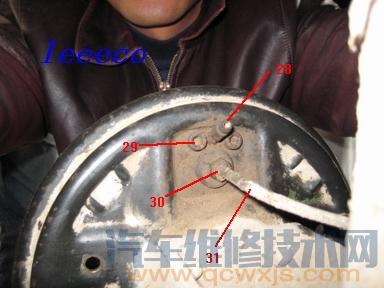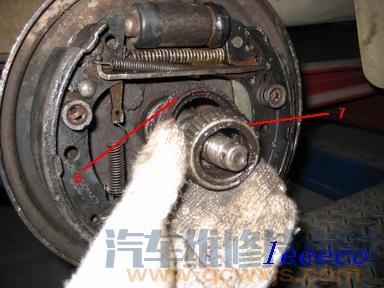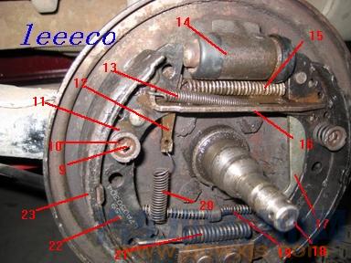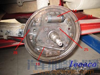 14——制動輪缸。踩剎車時液壓油推動風泵中的活塞向兩邊推,使制動蹄張開。活塞上有耳槽,嵌入制動蹄上端。