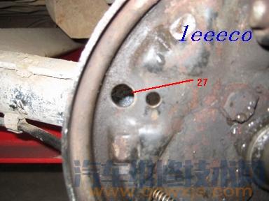從底板后面拆下26,就能通過觀察孔27觀察摩擦片23和制動鼓1間的間隙。