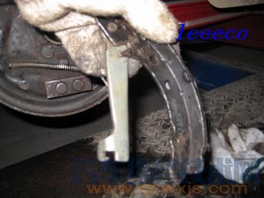 從駐車制動拉索19上卸下右制動蹄。右制動蹄上的駐車制動杠桿17上的鉤子形狀比較特殊,拆的時候先向坐擠壓彈簧然后向后退出。