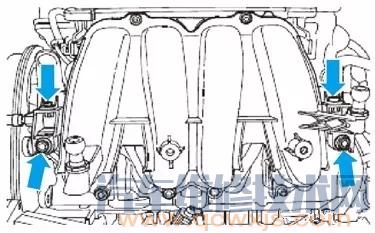 松開連接進氣歧管下部件和汽缸蓋的所有普通螺栓(箭頭);