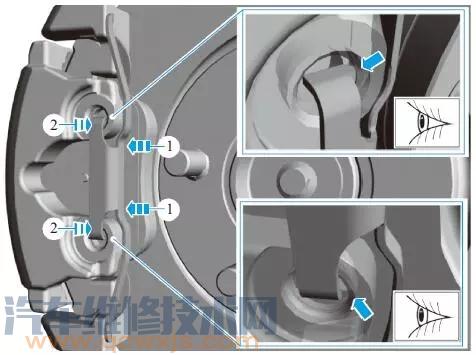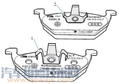 制動摩擦片標記如下圖所示,帶有較大三腳架1 的制動摩擦片安裝在內側(活塞側),帶有較小三腳架2 的制動摩擦片安裝于制動鉗殼體外側。