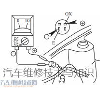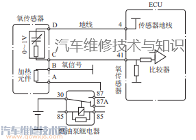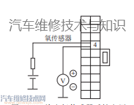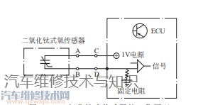 當(dāng)排出的廢氣中氧濃度隨發(fā)動機混合氣濃度變化而變化時,氧傳感器的電阻隨之改變,ECU的D端子電位也隨著變化,當(dāng)D端子上的電壓高于參考電壓時,ECU判定混合氣過濃;當(dāng)D端子上的電壓低于參考電壓時,ECU判定混合氣過稀。通過ECU的反饋控制,可保持混合氣的濃度在理論空燃比附近。在實際的反饋控制過程中,二氧化鈦式氧傳感器與ECU連接的D端子上的電壓也是在0.1~0.9V之間不斷變化,這一點與二氧化鋯式氧傳感器是相似的。