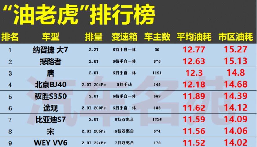 首先來看下排名前十的SUV“油老虎”,根據榜單顯示,這10款SUV的市區油耗都在14L以上,其中納智捷大7 SUV算是實至名歸,而福特撼路者和比亞迪唐緊隨其后。而銷量表現不錯的大眾途觀,排名第5位,而根據188位大眾途觀車主實測的數據來看,大眾途觀的市區油耗在14.1L左右。另外,排名后四位的都是我們國產車,比亞迪旗下的比亞迪S7和比亞迪宋雙雙上榜,它們都是2.0T 6擋雙離合車型,其市區油耗都在14L左右。而質量口碑不錯的WEY VV6也是油耗超高,還有名爵旗下的名爵HS,也是非常費油。