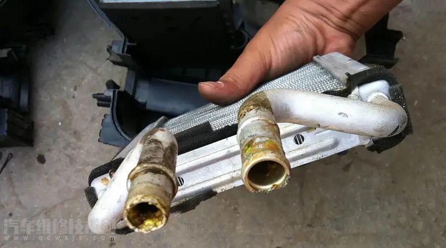 將此處的管路段開,從管口向暖風水箱內送入高壓空氣,將其內部的冷卻液排出。在這個過程中,發現水流排出不暢,且排出的液體中含有較多雜質,看起來像是密封膠凝固后的碎屑。拆除暖風水箱,可以看到管路上附著有較多雜質碎屑和凝固的密封膠。由于無法清除暖風水箱內部的堵塞物,最終將該水箱更換,故障排除。