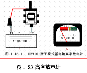 對于單格鏈條不外露的蓄電池只能測量整個(gè)蓄電池的端電壓.采用專用的大量程高率放電計(jì)測量這種蓄電池方便而準(zhǔn)確。這種放電計(jì)的正面表盤上設(shè)有紅、黃、藍(lán)色的條形,分別表明蓄電池的不同放電程度,其中紅色區(qū)域表示虧電或有故障;黃色區(qū)域表示虧電較少或技術(shù)狀況較好;綠色區(qū)域則表示電充足或技術(shù)狀況良好。如圖1-23所示: