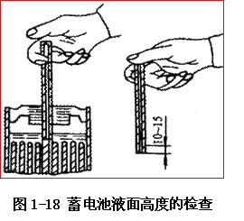 將試管插至蓄電池單格內(nèi)極板的上平面上,用拇指壓住玻璃管上端,使管口密封后提起試管, 此時(shí)試管中液體的高度即蓄電池電解液液面的高度,其標(biāo)準(zhǔn)高度值應(yīng)為10~15mm。低于此值時(shí),應(yīng)加注蒸餾水并使其符合標(biāo)準(zhǔn)值。