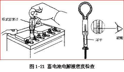 電解液相對密度每下降0.01g/cm3,相當(dāng)于蓄電池放電6%。由此,根據(jù)電解液密度可以確定蓄電池的放電程度。一般規(guī)定,蓄電池冬季放電達(dá)25%,夏季放電50%時(shí)不宜再使用,應(yīng)及時(shí)進(jìn)行充電,否則會使蓄電池極板硫化而提前報(bào)廢,如圖1-21所示。