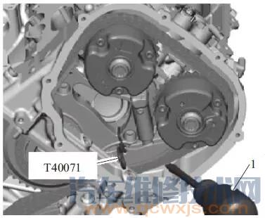 12. 將固定螺栓T40069直接擰入孔內。固定螺栓T40069必須卡入曲軸1的固定孔里,否則再次調整。