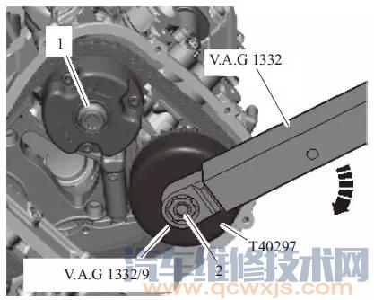 ■ 讓另一位機械師用40N·m的力矩沿箭頭方向預緊凸輪軸調節器。