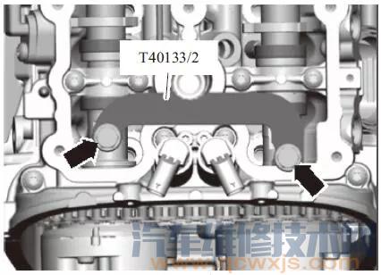 凸輪軸固定裝置T40133/2安裝到氣缸蓋上,然后用25N·m的扭矩擰緊。▼