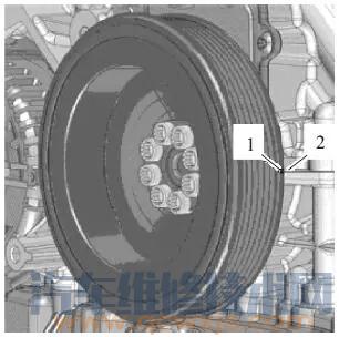 5. 用適配接頭T40058和彎曲的環形扳手沿發動機轉動方向將曲軸轉動到上止點位置。轉動發動機,使左側(沿行駛方向)減震器上的小缺口1與氣缸體和梯形架之間的外殼接合線2相對。這樣稍后就可以方便地擰入固定螺栓T40069。減震器上的標記僅僅是