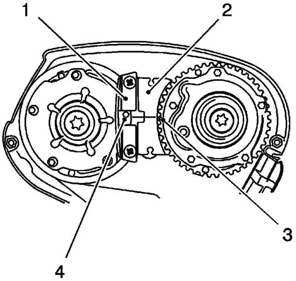 (2)排氣凸輪軸位置執行器調節器上的點式標記(上圖中的數字3標記處)與鎖止工具EN-6340右側(上圖中的數字2)的凹槽必須一致。