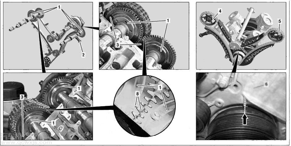奔馳gl350正時鏈條記號校對方法,把曲軸轉到OT點的后40度,對準缸體的一個記號,兩列氣缸的進氣凸輪軸齒輪上有一個記號對準各自邊缸蓋的邊緣,進氣凸輪軸齒輪上另一個記號在上方,還有一個記號和排氣凸輪軸齒輪上的兩個短線對齊,排氣凸輪軸另外一個方向上的兩個短線和缸蓋邊緣對齊,平衡軸也有一個記號和缸體上的記號對齊,正時就對好了。