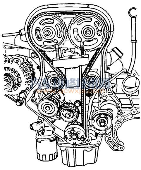 圖1-1-5 曲軸齒輪正時標記對準后正時皮帶罩底部缺口