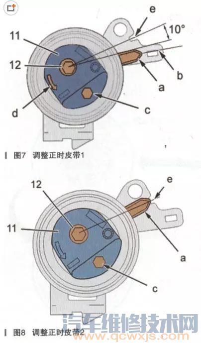 ③如果張緊輪指針(如圖8中a所示)不處于其調整位置(如圖8中e所示):重新進行安裝正時皮帶的張緊操作。