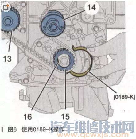 (5)將新正時皮帶定位在曲軸小齒輪(如圖6中巧所示)上。使用工具0189-K固定正時皮帶。