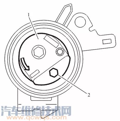 注意:當擰緊張緊輪螺栓時, 張緊輪不得轉動。否則, 重新張緊正時皮帶。張緊輪上的內六角螺栓2 應低于氣缸蓋與氣缸體的結合面D ( 約15°), 否則,更換張緊輪, 或正時皮帶, 或張緊輪總成。