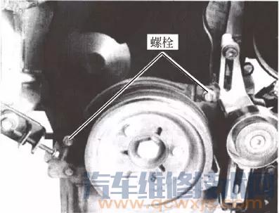 14. 拆卸曲軸帶輪3個固定螺栓,取下曲軸皮帶輪(下圖)。