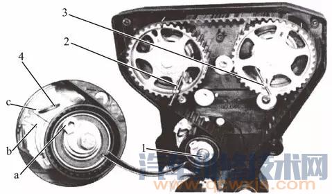 13. 逆時針方向轉動張緊輪指示器(上圖中的c)定位在圖中的b處,便可將正時皮帶置于最松弛狀態。