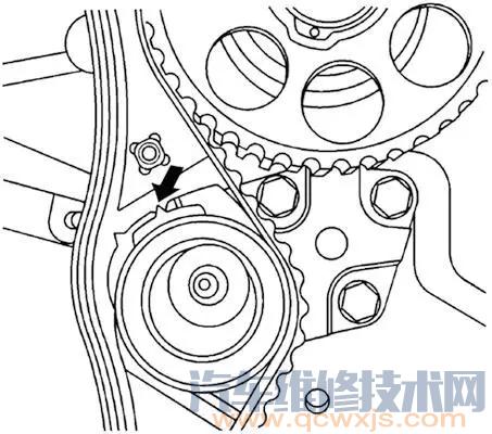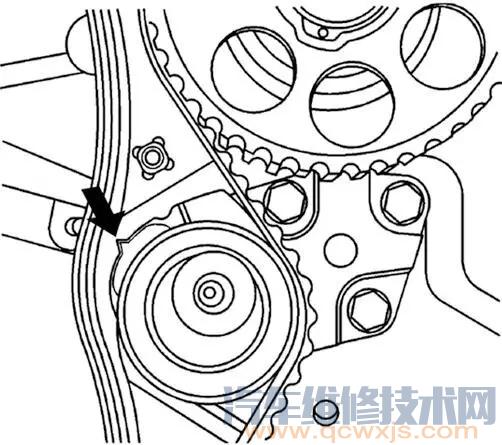 5. 順時針轉動水泵,直到正時皮帶自動張緊器調節臂上的指針對準正時皮帶自動張緊器托架上的缺口(下圖箭頭所示)。