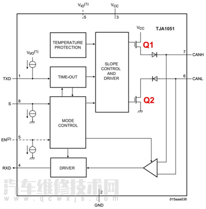 總線顯性時(shí),收發(fā)器內(nèi)部Q1、Q2導(dǎo)通,CANH、CANL之間產(chǎn)生壓差;隱性時(shí),Q1、Q2截止,CANH、CANL處于無(wú)源狀態(tài),壓差為0。